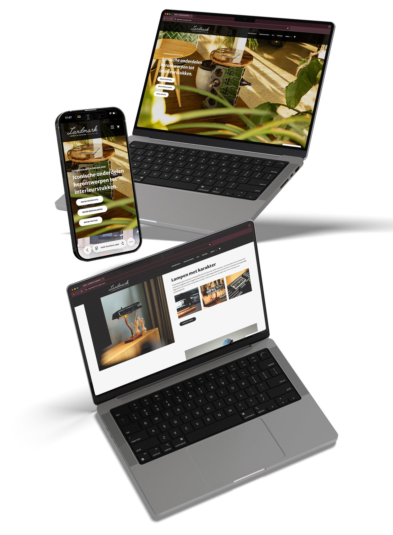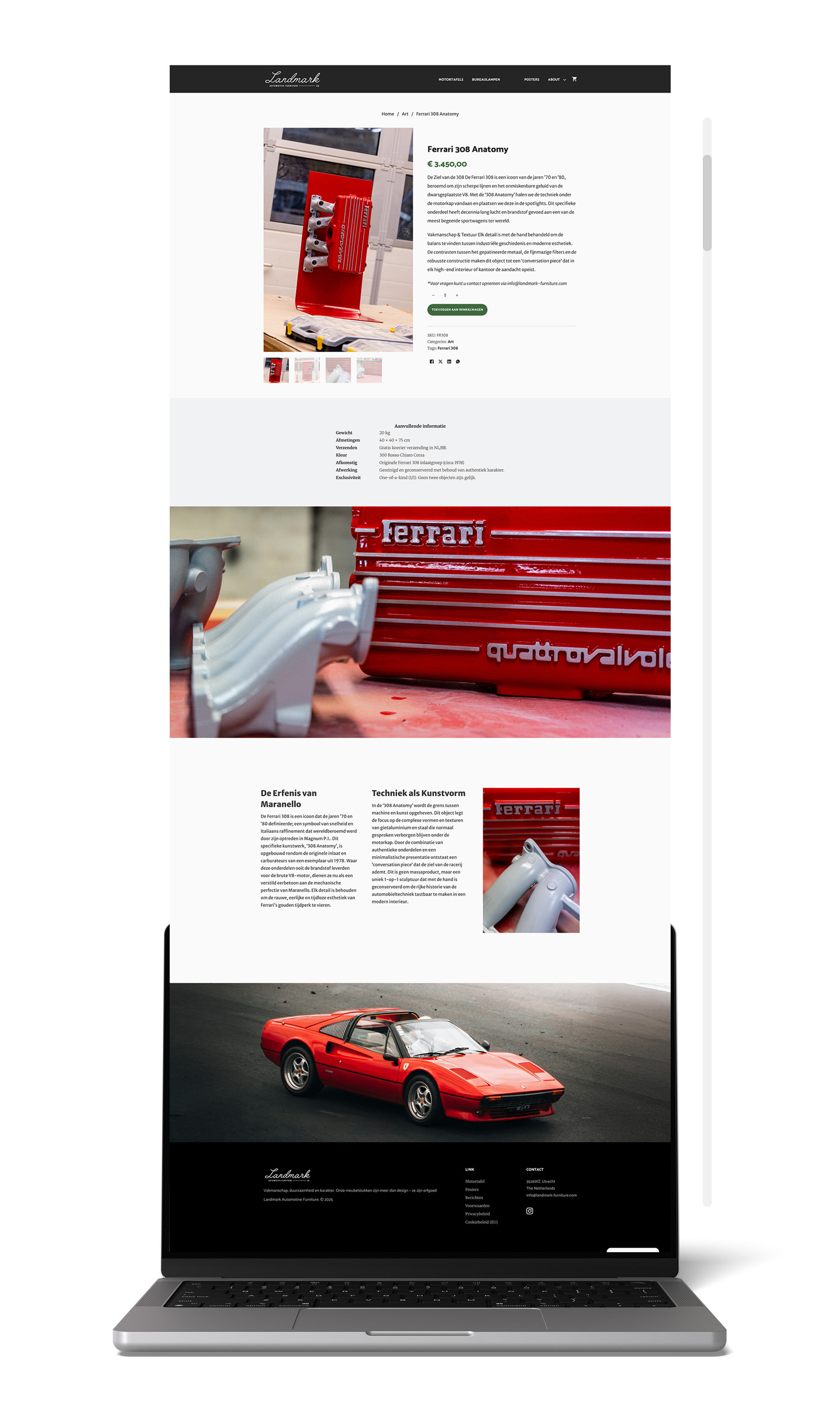 Voor mijn eigen label Landmark heb ik de volledige merkidentiteit en digitale aanwezigheid ontwikkeld, waarbij de passie voor automotive design wordt vertaald naar high-end interieur. Ik heb de website volledig zelfstandig ontworpen en gebouwd in WordPress met de Bricks builder, wat zorgt voor een razendsnelle en visueel unieke gebruikerservaring die naadloos aansluit bij de luxe positionering van het merk. Naast de technische realisatie heb ik ook alle product- en lifestylefotografie verzorgd om een consistente, hoogwaardige beeldtaal te waarborgen die de details en materialen van de ontwerpen tot leven brengt.